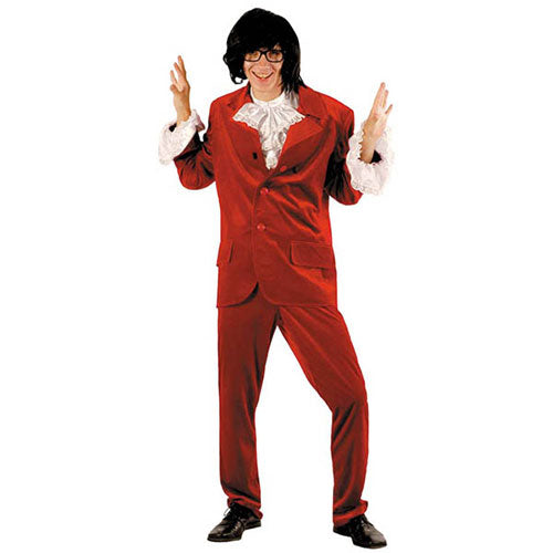 Composition produit : déguisement comprenant un ensemble veste à manches longues et pantalon en velours rouge et un plastron.